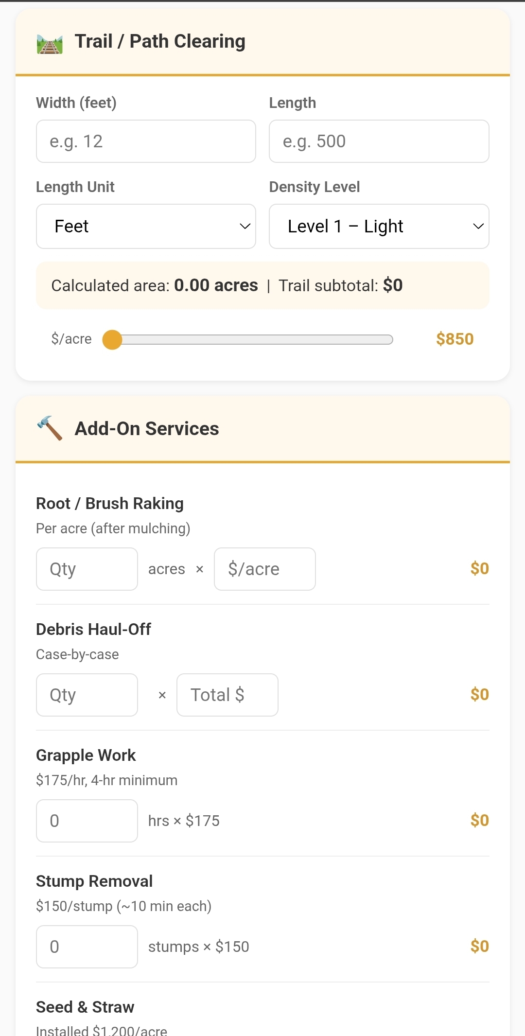 A cost estimator for forestry mulching and land clearing projects. It covers clearing density pricing by level, trail and path clearing calculations, add-on services like root raking and stump removal, mobilization fees, and generates a detailed project estimate with PDF and image export.